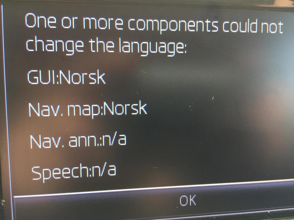 Jeg klarer ikke å få norsk språk i navigasjonsmeldinger. Så snart jeg skrifter til et annet språk, så "snakker" navigasjonen. Skifter jeg tilbake til norsk i bilen, så kommer det feilmelding om at norsk språk er loadet i GUI, men IKKE for navi announcements. Har fullført siste kartoppdatering og alt annet fungerer. Anyone?